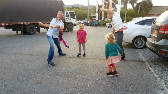 Det hade hunnit bli sent och vi var rätt hungriga när vi körde tillbaka mot hostelet. Plötsligt stannade Anders bilen och på ett högst märkligt vis slängde han sig ut. Jag, Anna och barnen satt kvar och undrade vad det var som hände. Agnes satt blickstilla, knep ihop munnen och såg ut att kunna spricka vilken sekund som helst. Plötsligt brutal-knackade det på rutan och jag såg en kalufs och två breda leenden utanför. In slängde sig sedan två människor under höga jubel och tillslut kopplade hjärnan ihop de två ansikterna som inte alls passade in här, Hanna och Gavin! Dessa två underbara glädjespridare som vi mötte på Humbertos båt i San Blas satt nu här i vår hyrbil, i en liten by mitt ute i ingenstans i Colombia. Det visade sig att Anders, Anna och Agnes stött på dem tidigare under dagen. De bestämde sig för ett överraskningsmoment och lyckades minst sagt, även om Agnes hann bli blå om läpparna av att ha hållt andan så länge. Nu följde de med oss till vårt hostel där vi fick kvällen tillsammans. Åh vilken lycka det var att få se dem igen så snart! Detta är två människor som sannerligen gör världen lite gladare.