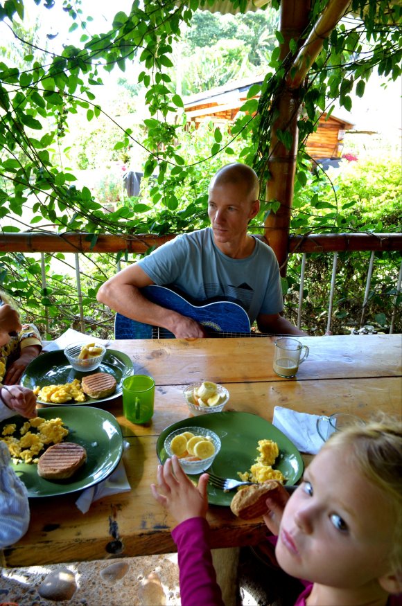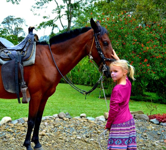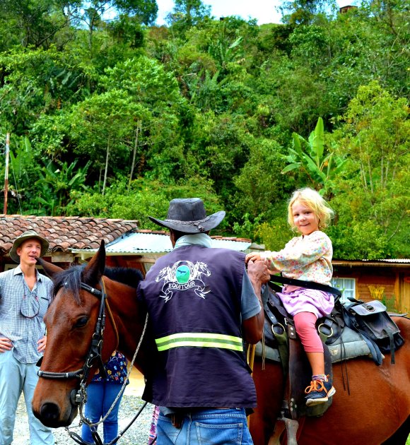 Dagen efter fick vi belöning för slitet från den långa bilkörningen. Agnes väckte mig tidigt, ”Ska vi gå en morgonpromenad, bara du och jag mamma?”. Detta är hennes nya grej på morgnarna och när man väl lyckats ta sig ur sängen så brukar jag tacka henne. För de där riktigt tidiga morgontimmarna är de bästa på hela dygnet. Hand i hand strosade vi runt i den svala bergsluften bland alla dofter och färger och vi hann med att både doppa tårna i den kalla floden och titta på kollibris som luftdansade runt blommorna innan det var dags att väcka de andra för frukost. Detta hostel är absolut ett av de vackraste jag har bott på. Det låg placerat mitt i skogen med höga berg som avtecknades i dimman runtom och trädgården var full av färgglada blommor och grön växtlighet. Lugnet och tystnaden här var också ett välkommet inslag efter allt dån och buller från storstaden.