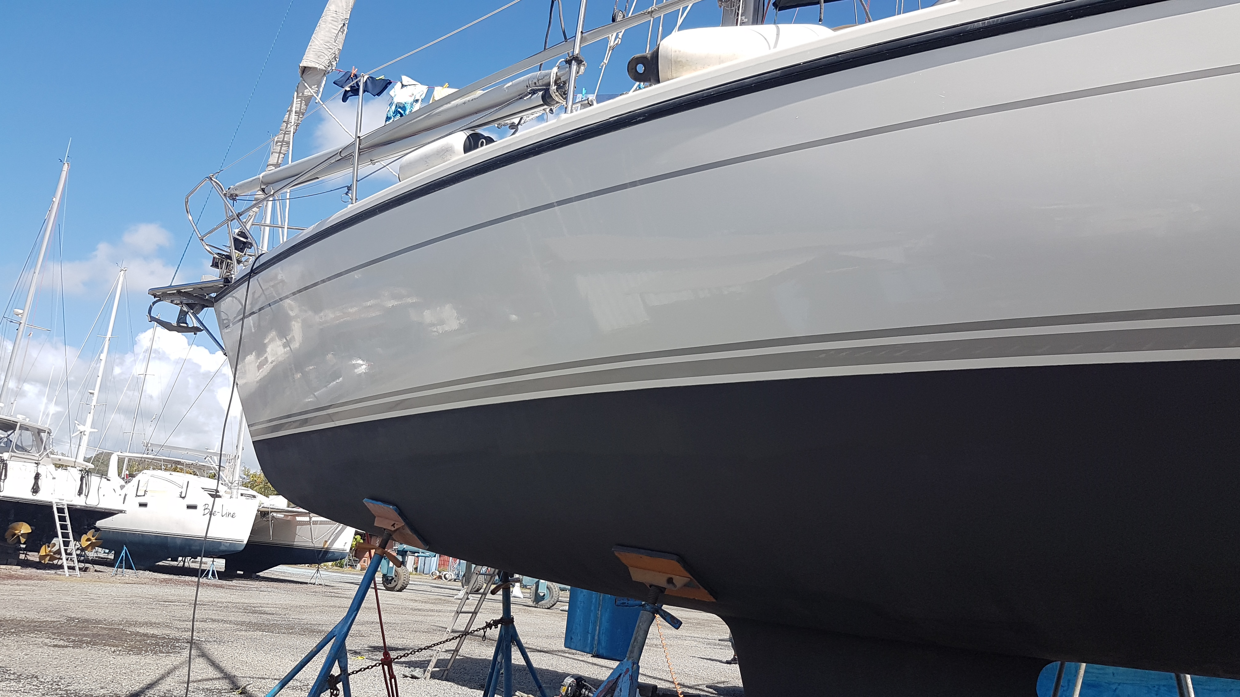 Marinan i Puerto Velero hade tyvärr visat upp en ny sida för oss under tiden vi varit iväg. En olycka hade hänt med en av båtarna som stod uppställda på land där en av stöttorna, som ska stadga upp båten, hade get vika då de var uppställda på alldeles för sank mark. Därmed hade hela båten vält och stöttan hade gått igenom ena sidan och rivit upp ett stort hål. Detta under tiden som den unga familjen befann sig i båten. Ja det hade kunnat få ett fruktansvärt slut men som tur var blev resultatet endast materiella skador. Marinan skötte det hela väldigt oprofessionellt och vi var många som där och då tappade förtroendet för personalen. Därför ville vi ha Nausica uppe på land så kort tid som möjligt och vi lyckades även förhandla så att Nausica fick hänga kvar i den gigantiska traversen, plus att de fick sätta de vanliga stöttorna runtom båten. Men när deras beräkning först landade på två veckor skakade vi bestämt på våra huvuden. ”Glöm det, inte mer än en natt”. ”Glöm det”, fick vi tillbaka, ”ni kan aldrig göra jobbet på under en vecka.” Men med en idiots envishet så skruvade vi i våra nu full-laddade mänskliga duracellbatterier och medan barnen lekte hos nyfunna spanska vänner så svettades jag och Anders bland bottenfärg, polermaskiner och målarpenslar. Vi tyckte att vi jobbade hårt men några som jobbade ännu hårdare var myggen runtomkring oss. Då uppställningsplatsen var omringad av sumpmark så var det förfest, efterfest och helfest för de blodtörstiga flygfäna och vi var vip-gäster på kalaset. Det blev ett blodigt dygn och vi var otroligt lyckliga när vi svettiga och sönderbitna kunde sjösätta igen dagen efter.