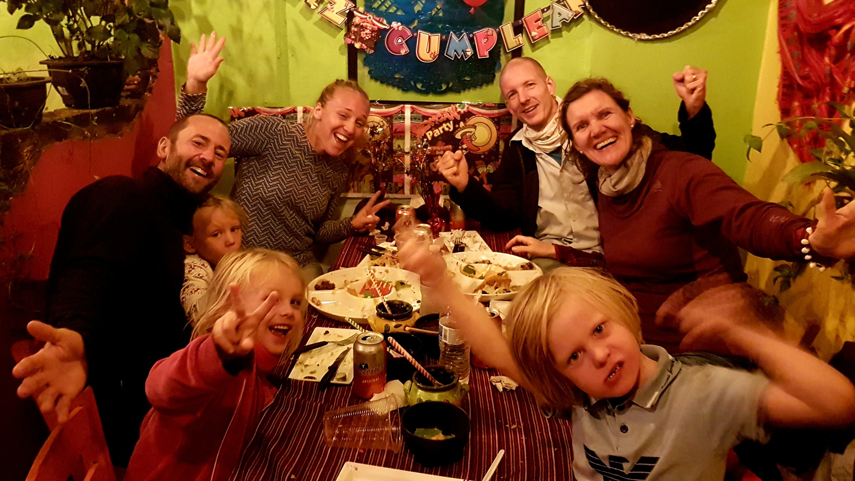 Vi hann med att turista en del i Bogotá men vi såg också till att ha mycket tid för barnlek och avslappnande pratstunder. Det var längesedan vi sågs och vi alla hade gjort resor och upplevt saker som vi gärna ville höra om. En av kvällarna blev jag överraskad på en mexikansk restaurang som Anna och Martin sett ut åt oss. Där fick jag uppleva födelsedag igen med tårta och paket och det hela lyftes till ytterligare en nivå när det mitt under den mexikanska födelsedagssången sköts tårgas några kvarter bort. Det blev ett spännande avbrott när personalen rusade ner för att slänga igen de tunga portarna till resturangen och låste ett antal hänglås om oss. ”Det är ingen fara alls, ni är trygga här” sa vår servitris samtidigt som hon gjorde korstecknet och bad en bön upp mot skyn. Vi följde utvecklingen av demonstrationerna och när de dragit bort en bit såg vi till att smita hem innan det blev allt för sent. Det blev en supermysig kväll ändå och den här födelsedagsmiddagen kommer jag sent att glömma.