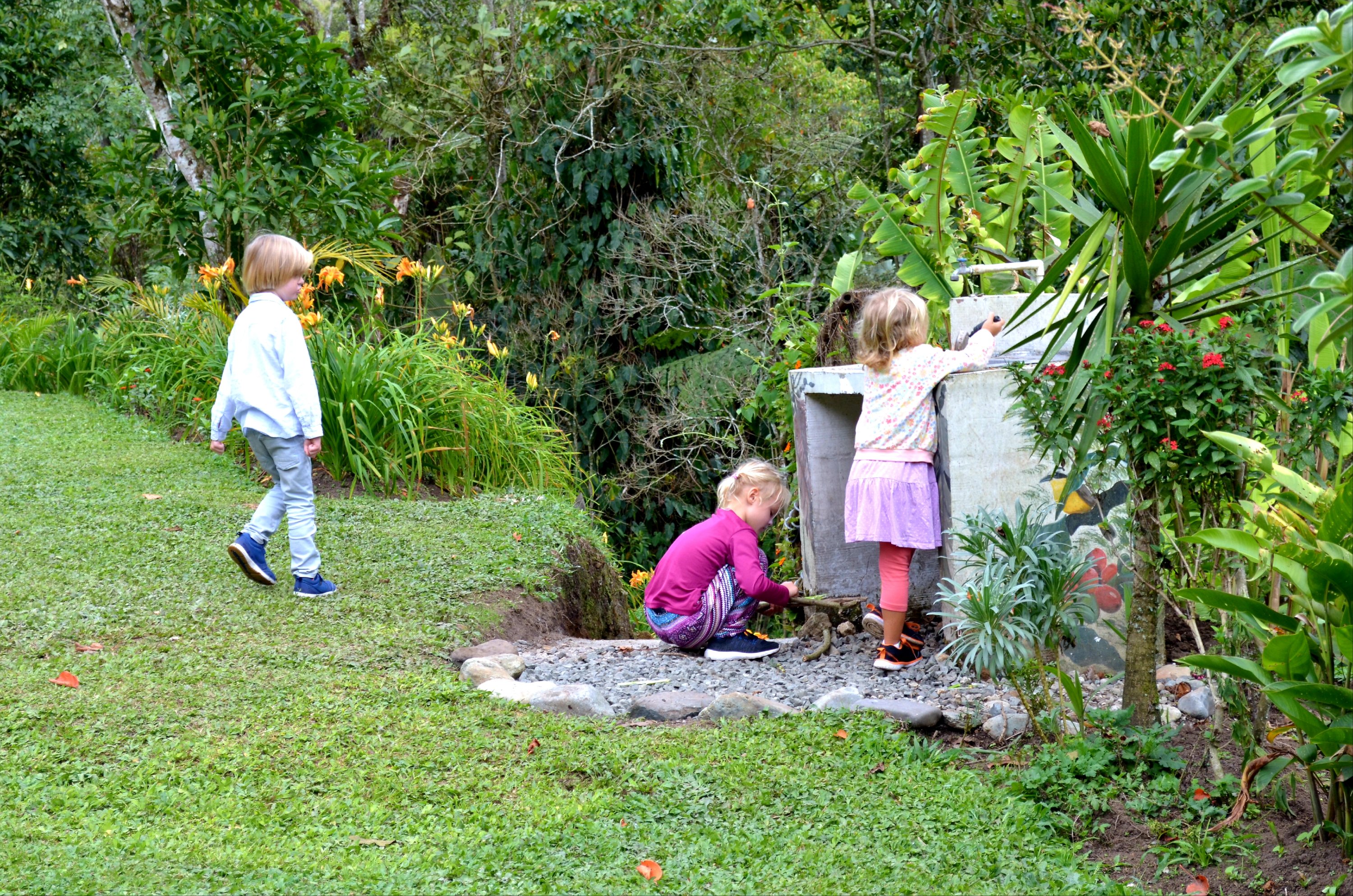 Dagen efter fick vi belöning för slitet från den långa bilkörningen. Agnes väckte mig tidigt, ”Ska vi gå en morgonpromenad, bara du och jag mamma?”. Detta är hennes nya grej på morgnarna och när man väl lyckats ta sig ur sängen så brukar jag tacka henne. För de där riktigt tidiga morgontimmarna är de bästa på hela dygnet. Hand i hand strosade vi runt i den svala bergsluften bland alla dofter och färger och vi hann med att både doppa tårna i den kalla floden och titta på kollibris som luftdansade runt blommorna innan det var dags att väcka de andra för frukost. Detta hostel är absolut ett av de vackraste jag har bott på. Det låg placerat mitt i skogen med höga berg som avtecknades i dimman runtom och trädgården var full av färgglada blommor och grön växtlighet. Lugnet och tystnaden här var också ett välkommet inslag efter allt dån och buller från storstaden.