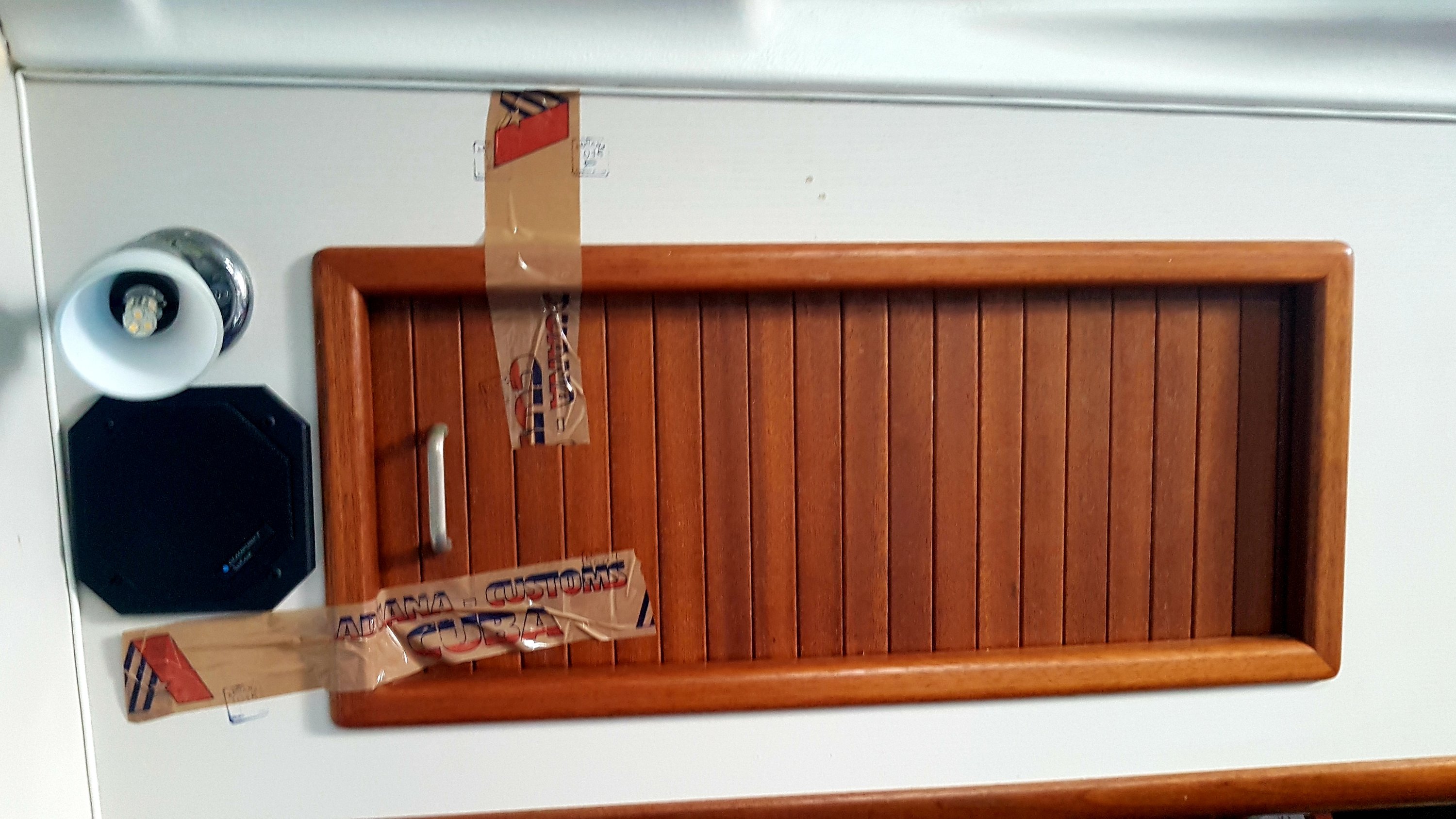 ”Fruit is good”sa han och kanske var det detta som gav oss vår ok-stämpel. Sedan kom knarkhundarna och luktade igenom båten. Ja två stycken faktiskt och det är möjligt att den första var en prao-elev. När vi så hade fått ett ok på att vi inte hade något Colombianskt kokain ombord, att vårt C-vitaminintag låg på en bra nivå och att papper och signaturer satt på rätt plats så skulle vi tillsist få gå av båten. Det var då de fick syn på vår mörka hemlighet. Drönaren. Det blev nu nästan hysteri på herrarna och en hög och snabb ordväxling på spanska utbröts i samma takt som svettpärlorna i deras pannor trädde fram. De började rota runt i sina medhavda portföljer och på två röda sekunder hade tejp och stämpel dragits fram. Drönaren blev instuvad i ett skåp som med största noggrannhet tejpades igen och tre prydliga stämplar dunkades dit runtom, rakt på vår vita trävägg. Sådär ja, nu kan de minsann aldrig få ut den, tycktes de tänka när de med betydligt mer lugn i sina rörelser återigen gick över till att prata artig engelska med oss. Sedan fick vi tillslut gå iland och fortsätta incheckningen.