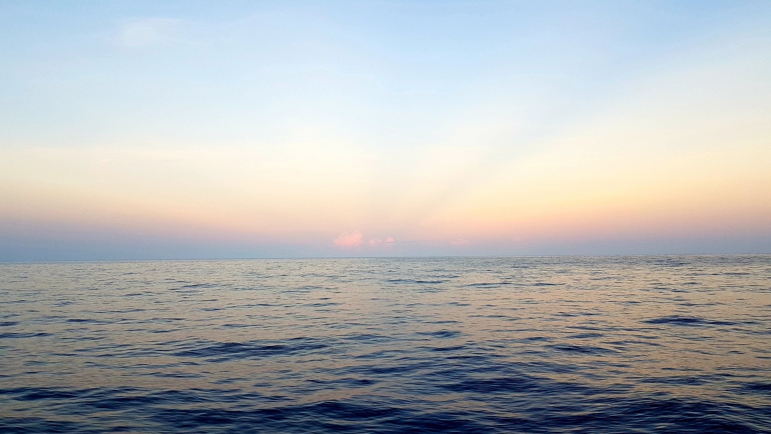 Vi hade klarerat ut ur Kuba för att så sakta ta oss mot Bahamas och hade fått tillåtelse att stanna en natt i en ankarvik strax öster om Guantanamo. Vi gjorde en nattsegling förbi detta otäcka ställe och gjorde det obligatoriska slaget ut för att hålla minst 6 sjömil bort. Jag vet inte vad straffet hade blivit om vi gått för nära men vi kände oss heller inte så sugna på att ta reda på det. Natten var mörk och Guantanamobasen lyste och blinkade inifrån och det kändes otäckt att tänka på vad som försigicks där inne, ändå så pass nära. Dagen efter kom vi fram till vår lugna ankarvik. Inte en krusning rördes på ytan, inte ett ljud hördes inifrån land. Här fanns inga bolmande industrier som i ankarviken i Santiago de Cuba och luften luktade inte det minsta diesel. Båten låg alldeles stilla, en pelikan kikade trött på oss och den varma eftermiddagssolen börjar så sakta färga himlen allt mer rosa. För en gångs skull var det helt tyst omkring oss. Det är sällan det händer ombord på Nausica då halva besättningen består av två härligt intensiva och viljestarka barn, men just i den här stunden var det som att allting landat även för dem. Vi satt i skuggan under soltaket och bara andades.