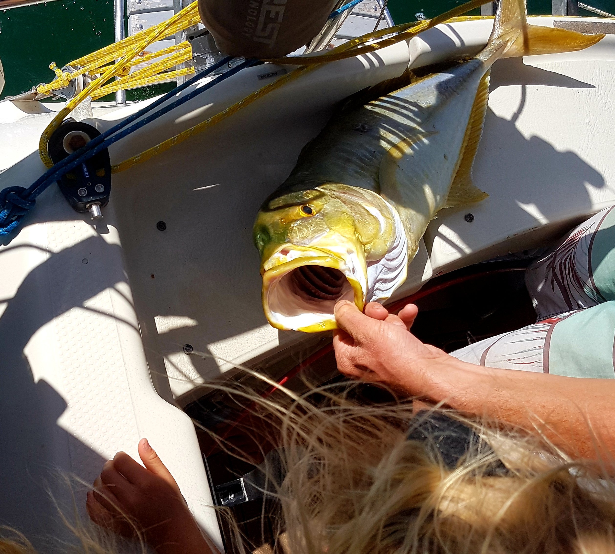 Det var sedan ett väldigt hålligång på fiskelinorna och vid ett tillfälle stod både jag och Anders och vevade samtidigt in varsin vacker Mahi Mahi medan Tilda och Agnes glatt hejade på. En natt fick vi upp en gigantisk Baracuda och det där är minsann en riktig muskelknutte till fisk. De är långsmala med stora sylvassa tänder som de gärna visar upp genom att långsamt öppna och stänga munnen om man råkar komma för nära dem under en snorklingstur. De är också väldigt nyfikna av sig så det är inte ovanligt att de slår följe med en längs korallrevet. Jag blir fortfarande rädd när jag möter en även om jag läst att de väldigt sällan biter en människa. Men just det där ordet Sällan och att det inte står Aldrig gör det svårt att helt slappna av när de simmar efter en. Dessa fiskar ska tydligen vara en av de godaste att äta men de kan också innehålla det otäcka giftet Chiguatera. Åtminstone de stora Baracudorna. Den som trött men ilsket stirrade på oss den här natten var gigantisk så det var det ingen tvekan om att den skulle tillbaka ner i djupet igen. När vi såg de där tänderna gnistra i månskenet så kändes det riktigt skönt att inte få ombord den, Anders krokade loss den med handskar på och med stora polygriptången till hjälp.