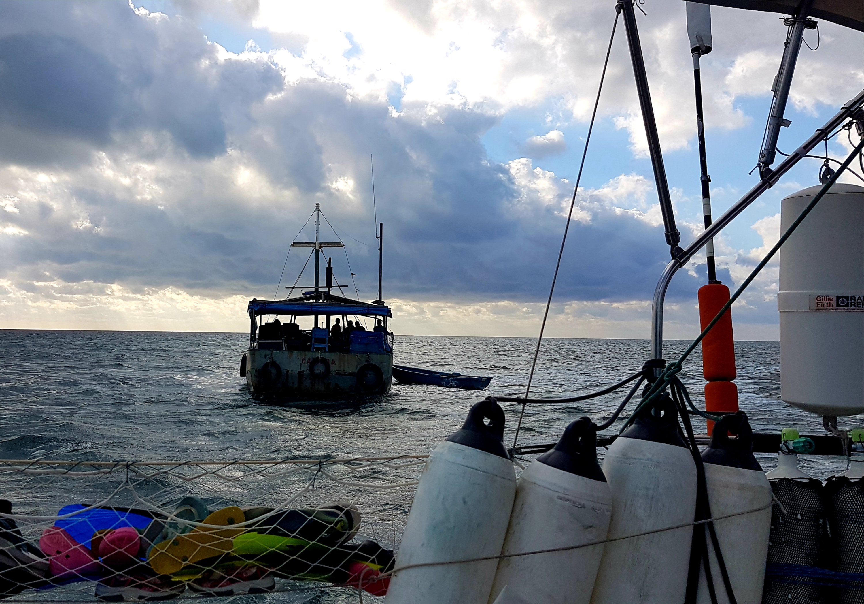 Vi seglade mot Jardines de la Reina där vi hittade en fin liten ankringsplats strax innanför revet. Morgonen därpå kom en stor stålbåt emot oss. Den såg rejält ruffig och sliten ut och kom alldeles intill oss. Jag började tänka på hur ensamma vi faktiskt var här ute och hur vi skulle kunna ta oss härifrån om båtens besättning inte visade sig vara vänligt inställda till oss. Men som tur var så hejade de glatt och ropade åt oss att vi kunde följa med dem längre in, det rullar mindre där skrek de på spansk-engelska och med vänliga ögon. Vi bestämde oss för att lita på dem och följde efter. De körde före oss hela vägen in mot mangroven och visade att det inte var så grunt som sjökortet varnat för. Anders och Tilda körde över med ett sexpack Colombiansk öl till männen ombord som tack och det visade sig vara Kubanska fiskare. De blev glada över presenten och en spontan byteshandel uppstod. De behövde solglasögon, kepsar och annat solskydd och vi fick fisk och humrar i mängder. Barnen fick också två stora påsar fulla med kex och alla somnade nöjda den natten.