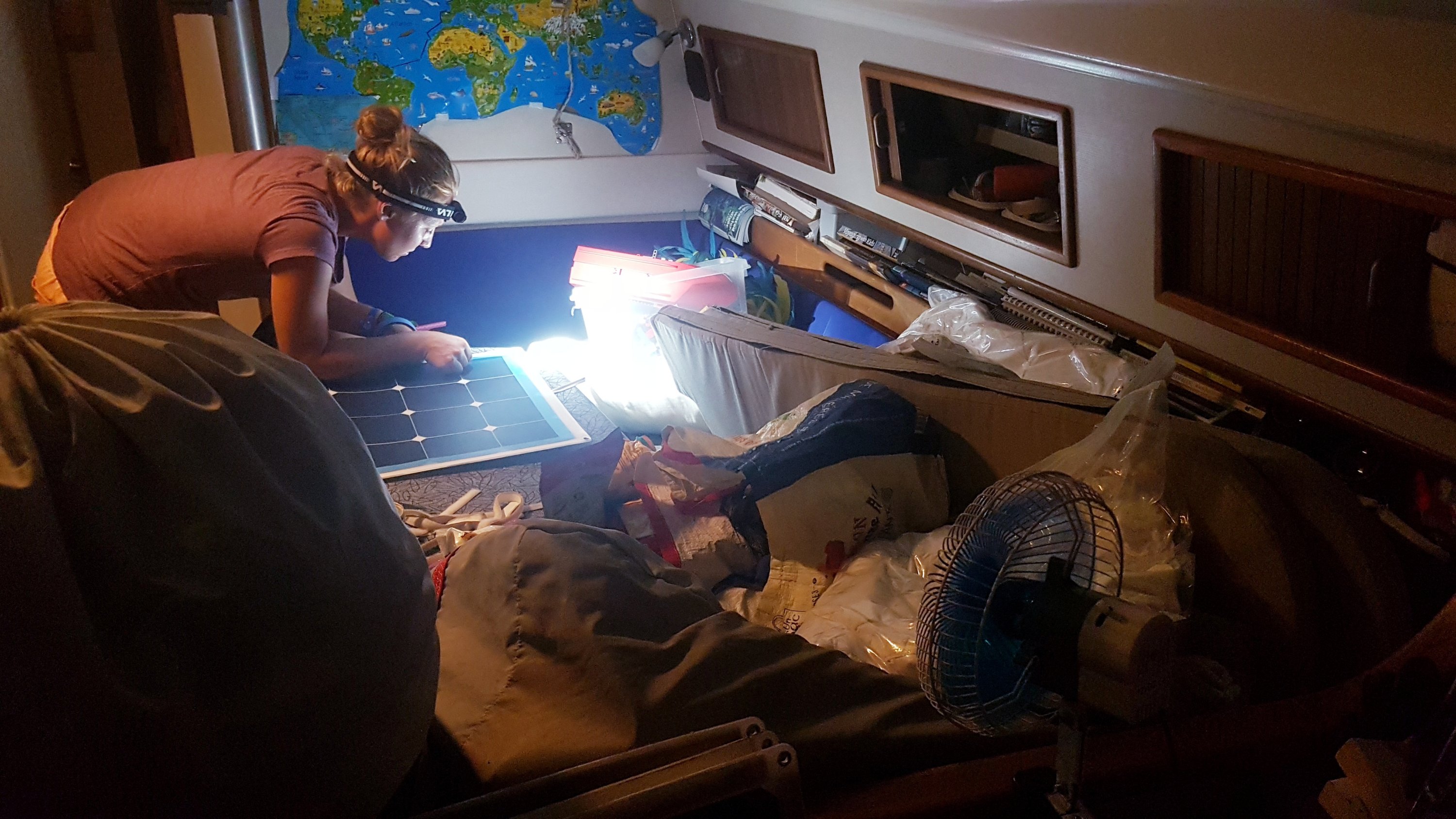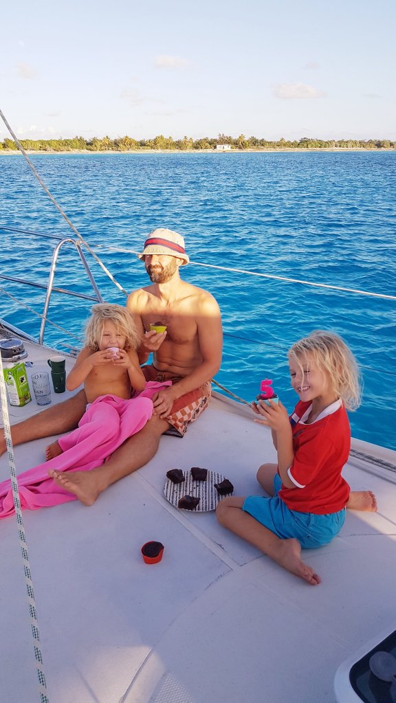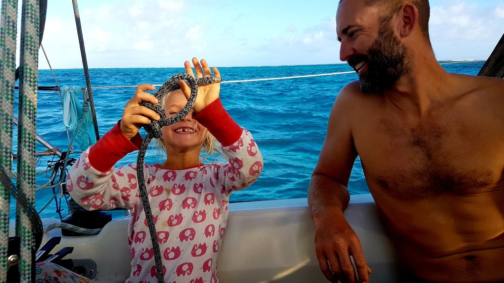 Älskade barn. Men vad jag avskyr de där första dygnen innan kroppen stabiliserat sig, havet känns aldrig så stort och oändligt som då, 7 dygn är fruktansvärt långa och helst vill jag bara lägga mig ner och sova. Det är såklart en omöjlighet när man seglar som familj, men Anders gör ett hästjobb med mat och logistik så att jag slipper gå ner så mycket. Jag har dock äntligen lärt mig att även om min sjösjuka aldrig helt försvinner så slutar jag att kräkas efter ett par dygn och då återvänder energin igen. Ja, livet kan sedan till och med kännas riktigt gött och jag njuter av fiskefångst och romantiska natthimlar igen. Då brukar jag också försöka att ta någon timmes längre nattpass så att Anders får lite extra sömn. Vi delar annars på nattpassen rakt av så att vi tar 5 timmar var. Jag går på det första klockan 22 efter att ha nattat barnen och vilat någon timme, och Anders avslutar sitt klockan 08.00. Vi har märkt att detta passar bäst för oss. Ofta kan man ställa klockan på var 15:e minut under sitt pass och därmed slumra en liten stund om natten är lugn.