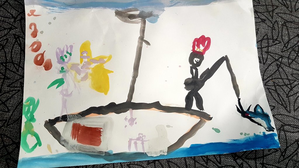 Barnen ritade med vattenfärg en teckning på pappa Fiskarkungen. När jag frågade vad jag gjorde blev svaret: ”Du är sjösjuk såklart!” Ja såklart.
