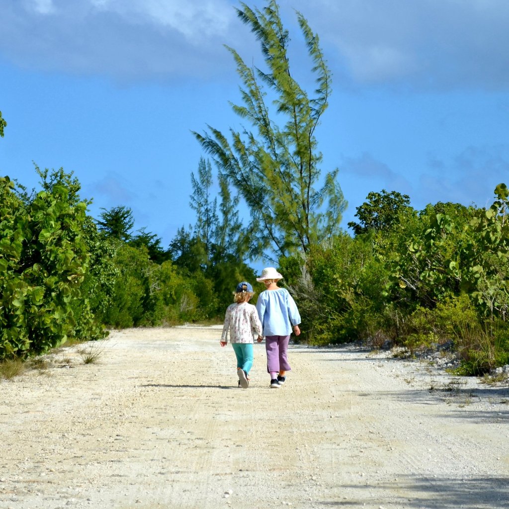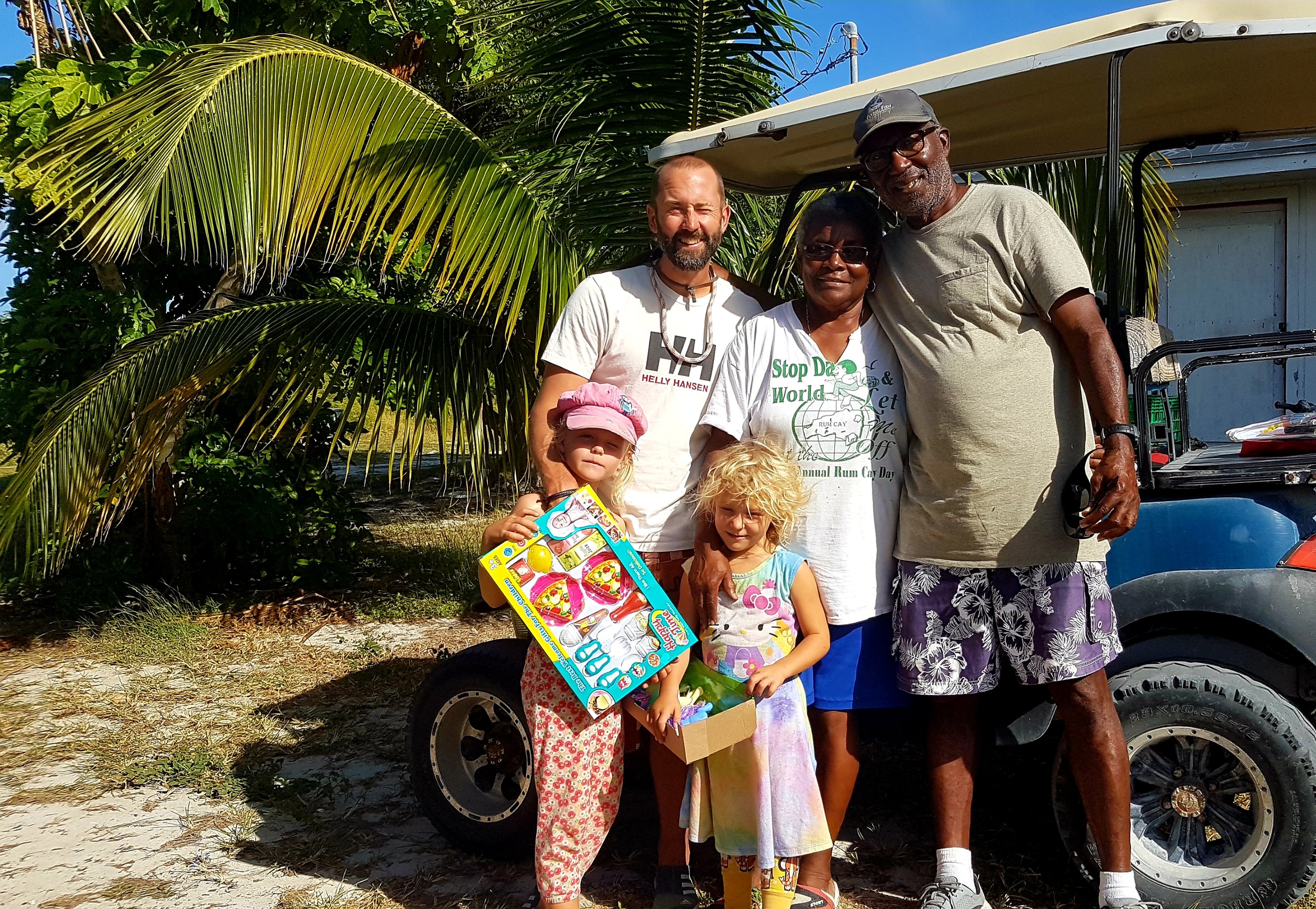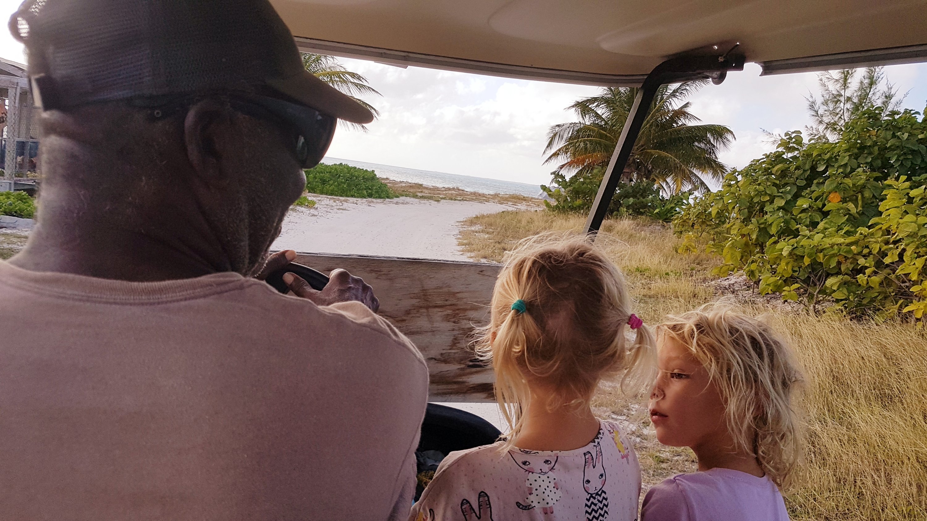 Det var fortfarande tidig morgon när vi backade fast ankaret i den mjuka, vita sanden. Då det var en hel del korallhuvuden som vi var rädda att stöta i, så höll vi oss rätt långt ut i viken. Sedan satte vi på starkt, starkt kaffe och högg i för att röja undan i båten igen. Det krävdes efter att båten gått som en torktumlare i hög sjö. Barnen hade sovit gott under natten och deras batteri var sprängfulla med energi. Anders och jag drack mer starkt kaffe och lyckades sedan, lutandes på varandra, få i jollen i vattnet och puttra in till ön. Det var dock lite klurigt att ta sig in då stora delar av hamnen vid första anblicken såg ut att vara igenblåst av sand. Men vi längtade efter frukt och grönsaker och hade ställt in näsorna på C-vitamin så vi snikade oss in mellan sanddynorna. Plötsligt dök det upp en man i en sittbrunn vars båt vi hade tagit för övergiven. ”Hö hö, här behöver ni inte låsa någon jolle” skrockade han när han fick syn på vår kätting och hänglås. ”På den här ön bor det 56 människor. Butiken är öppen mellan klockan 9 och 10. Ungefär. Ja det beror ju lite på när ägaren vaknar såklart. Och nu i dagarna ska hon ha barn så kanske att butiken är stängd när jag tänker efter…” Vi såg hur våra tomater flög iväg och ersattes av en burk krossade. Igen. Ungefär samtidigt kom det en annan man i en golfbil körandes. ”Visst har du väl lite glass hemma till barnen här?” frågade vår nya vän från båten med visst renoveringsbehov och hål i taket. Jo, visst hade han det och han ville gladeligen bjuda på dem för alla 6 barnen i skolan hade redan fått så mycket de kunde äta och han hade fortfarande frysen full. Sedan skjutsade han in oss till byn, introducerade oss för människor, hundar och getter och gav oss en grundlig historielektion av ön och Bahamas. Han bjöd oss på glass och öl hemma hos sig och fick oss att lova att komma tillbaka dagen därpå för mer glass. Barnen, som redan innan glassen varit långt över oss i energinivå, snubblade nu på orden av sprudlande glädje och pratade i mun på varandra för att berätta om allt mellan hav och land för deras nya vän. Agnes missade munnen med glassen en gång men fortsatte obekymrad med chokladglassavtryck på kinden att berätta sin historia för stora lyssnande öron.