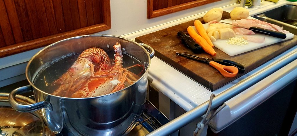 En tidig morgon nappade det äntligen på ett av våra fiskespön och en stor Mahi Mahi kunde efter en del svettande tillslut vevas in. Det är alltid en lika ödmjuk känsla som infinner sig ombord när vi får upp någon av dessa stora vackra fiskar. Då vi inte har någon frys så ser vi till att inte fiska mer än vi kan äta upp och dagarna efter fångst blir det fisk morgon, middag och kväll. En hel massa läckra och minst sagt kreativa recept har vuxit fram under den här resan. Anders som är fiskarkungen ombord stekte denna kvällen filéer och serverade dessa med nykokt potatis och svenskimporterad hollandaisesås. Under den middagen infann sig något så sällsynt som total tystnad ombord. Emellanåt hördes ett