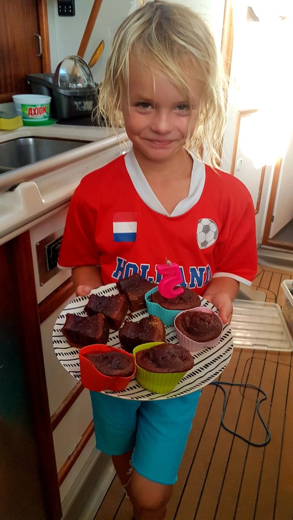 På eftermiddagen började det blåsa upp ordentligt och barnen skrek av glädje när regnet smattrade hårt mot båttaket. Till en början var det mysigt men ju mer blåsten tilltog och ju mer båten svängde runt i den trånga ankarviken, desto mer osäkert kändes det. Vi fick en ny väderprognos som visade att lågtrycket blivit betydligt starkare än utlovat. Vindbyarna klättrade upp mot 20 m/s och vädret för morgondagen skulle bli än värre. Vad hade vi för alternativ? Skulle vi ta oss in i marinan som låg bara en kort bit därifrån. Inte en rolig tanke att få upp ankaret i den här blåsten och sedan försöka navigera tillbaka i noll sikt och höga vågor för att ta oss över revet igen och in i en marina vi aldrig varit i tidigare. Men så väldigt skönt när vi väl kommit dit. För vad händer här? Kommer ankaret att hålla? Vi har endast legat här i ett par timmar så helt säkra på att vårt ankare fått ordentligt fäste var vi inte. Viken var som sagt för trång för mängden kätting som vi egentligen ville lägga ut i den här blåsten, och vi visste att det låg grund och klippor bakom oss. Hur blir det inatt och imorgon, vilken vind har vi att vänta om det ska öka ytterligare när väderprognosen för idag säger mindre vind än vad vi egentligen har? Vi hörde flera andra båtar kalla upp marinan på vhf:en och ville ha en plats. Finns det ens plats kvar i marinan? Vi hade en timme kvar av dagsljuset och tillslut tog vi beslutet, vi stannar. Vi gick igenom planen med barnen så de visste vad som skulle kunna hända, vi packade en grab-bag för värsta tänkbara scenariot och vi bestämde hur vi skulle signalera till varandra i mörker och med en vind som gör det omöjligt att höras. Vi bestämde oss också för att sitta ankarvakt under natten och la upp ett schema för detta. Sedan bakade vi minsann lussekatter. Med vinden tjutandes i riggen och vågor som letade sig in i viken, satte vi på julmusik och gjorde allt för att skingra tankarna på katastrof. Barnen var överlyckliga och Anders och jag tog tur i att med jämna mellanrum smyga upp i sittbrunnen och kolla till ankarlarm, djup och vindriktning. Vi kämpade ihop en sats med lussebullar och även om de inte kunde kvala in bland andra snygga lussebullar så njöt vi av den underbara doften som spred sig i båten och smaken av varma, nybakade lussebullar. Innan vi gick och la oss så la vi kläderna i en prydlig brandmanna-hög så att vi enkelt kunde studsa i dem under natten om så krävdes. Vinden la sig något under natten och ankarvakterna blev bekväma. På morgonen gjorde barnen frukost åt oss och doften av saffran låg fortfarande kvar i båten. Vi hade klarat av den här natten också. Helt klart den värsta på hela resan, men i efterhand blev den ändå rätt mysig med julstämningen på topp och magarna fulla med lussekatter.