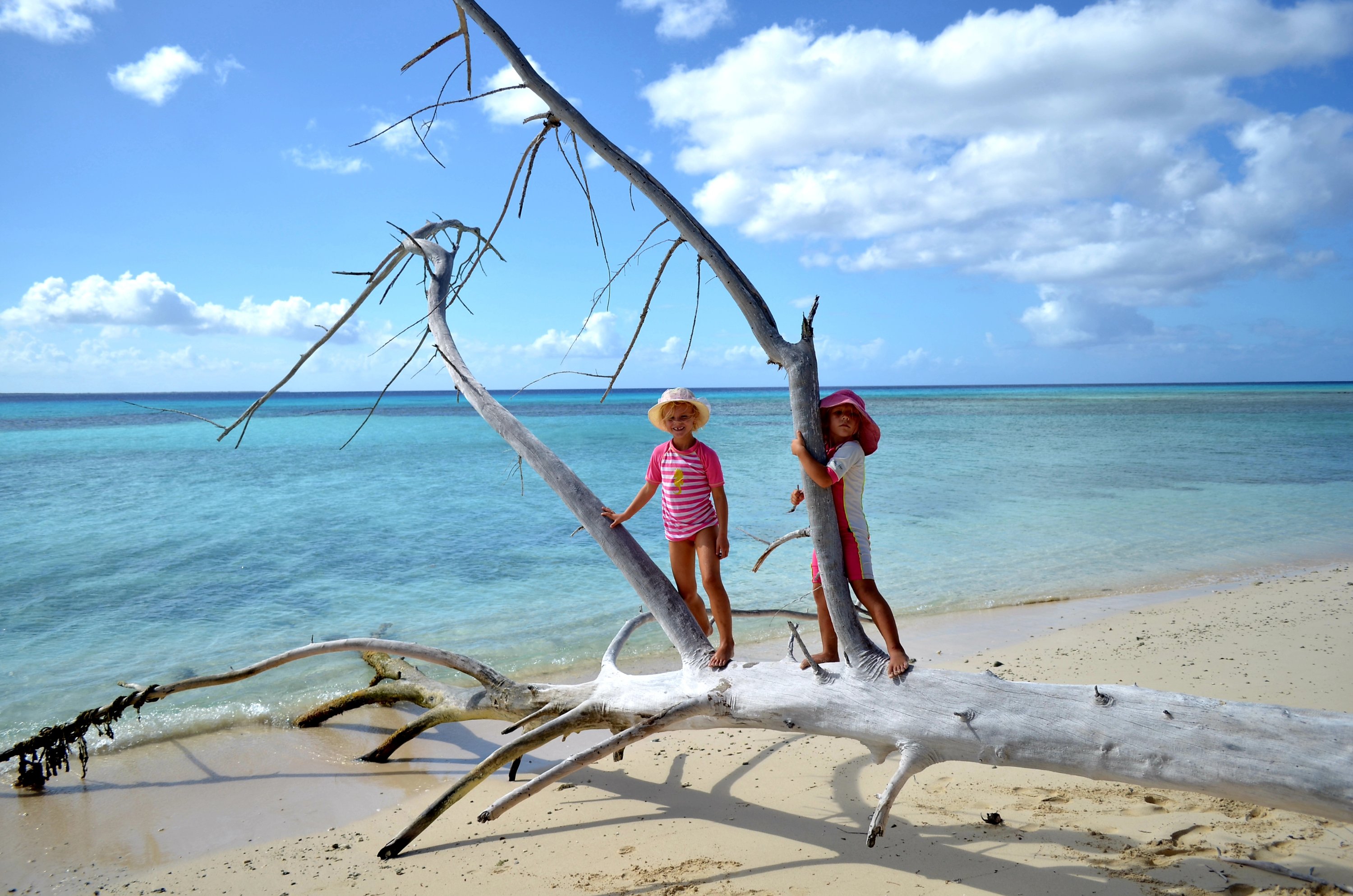 Vi fick ta oss rätt nära Hogsty reef innan vi såg hur atollen egentligen såg ut. Den var betydligt större än vad vi hade föreställt oss och den bestod till största delen av undervattensrev med endast ett par låga öar runtomkring. Och två stora fartygsvrak som bevisade vikten av att hålla koll på sin navigering. Det var ordentligt rulligt och för obekvämt för att ankra bakom en låg sanddyn utanför revet som planerat. Istället smög vi vidare in i atollen och i krypfart vågade vi oss vidare genom korallhuvudena. Anders styrde medan jag stod i fören och var korallvakt, men det var inte helt enkelt att se när det blåste så pass. Vi tog oss så långt österut det gick inne i atollen och tillslut hittade vi faktiskt en sandplätt där vi låg hyfsat still. Vinden ven ordentligt och det dånade högt från revet framför oss. Det var mäktigt och kusligt på samma gång när mörkret la sig kompakt runtom oss. Hela familjen var ordentligt trött efter en lång och spännande dag men det var svårt att helt slappna av under natten. De här reven vill vi inte hamna på med båten.