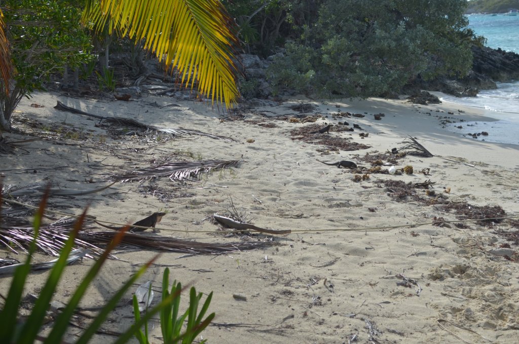 Iguanor på stranden. De är så bra kamouflerade så de var ibland svåra att urskilja från tång och palmblad på sanden.