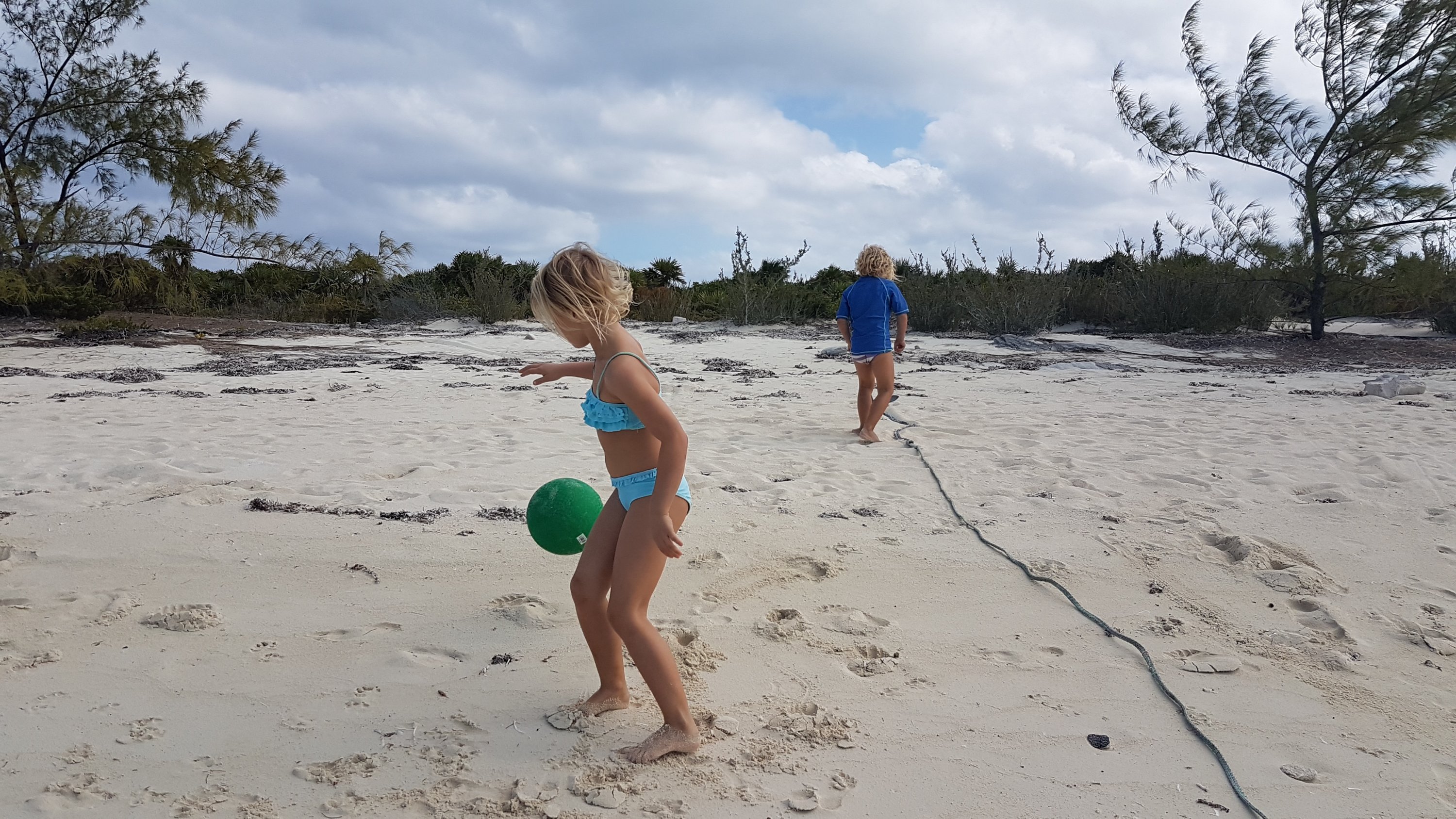 När passen med våra nya visum i tillslut var tillbaka så seglade vi tillbaka till Exumas och en liten ö som jag tyvärr inte minns namnet på. Här träffade vi en trevlig Kanadensisk familj med två barn och genast drogs en fotbollsturnering igång på stranden med vår nyinköpta boll. Det är tyvärr sällsynt med barn nuförtiden. I Karibien träffade vi fullt med nya vänner och barnen hade lekkamrater ombord i prinicp varje dag. Sedan vi lämnat Colombia har det varit betydligt färre och hur underbart det än är att leka med sina barn så saknar både vi och dem andra lekkompisar. Vi hoppades på att stöta på fler seglarfamiljer framöver, Bahamas känns ändå som ett ställe som borde innehålla en hel del barn.