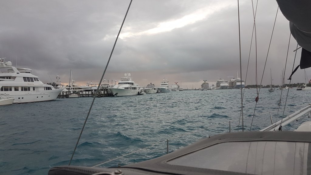 Dagen efter seglade vi vidare mot Nassau. Vi hade fått tid för vår intervju ett par veckor senare i ett steg att förhoppningsvis få ett visum in till USA. Egentligen hade vi kanske inte behövt stressa upp till Nassau redan men med alla lågtryck som rullade ner över oss vågade vi inte riskera att bli inblåsta igen. Vi hade fått intrycket av att Amerikanska ambassaden nog inte uppskattade förseningar. Så med stark vind i ryggen tog vi oss över det grunda vattnet mellan Exumas och New Providence, och utan större problem kunde vi se och styra runt korallhuvudena som låg som stora svarta plättar i vattnet. Det var spännande med två meter under kölen istället för två tusen som vi blivit vana vid. Den östra inseglingen till Bahamas huvudstad kändes lite nervig med grund på flera ställen och en hel del trafik. Men allt gick bra och vi kunde tillslut pusta ut när vi hittat en plats för oss i det välfyllda ankarområdet. Runtom oss låg lyxbåtar i storlekar som kryssningsfartyg och de segelbåtar som för oss varit gigantiska hemma i Sverige såg nu ut som små plastleksaker i jämförelse. Barnen diskuterade sinsemellan hur mycket diesel en båt egentligen kan släppa ut men diskussionerna blandades också upp av en viss avundsjuka över all lyx som får plats däri.