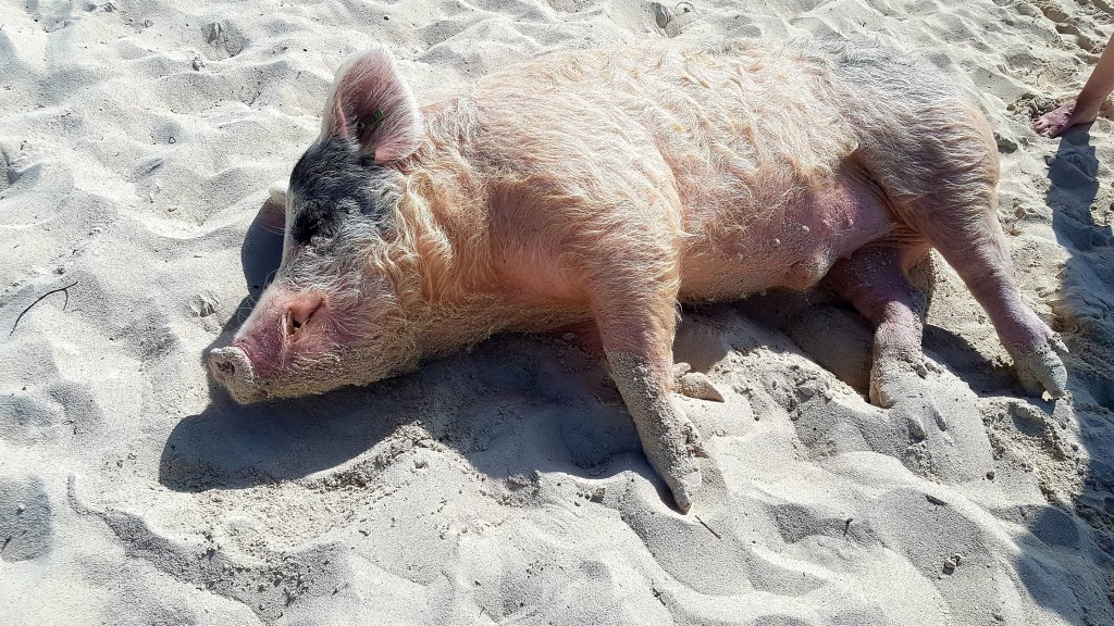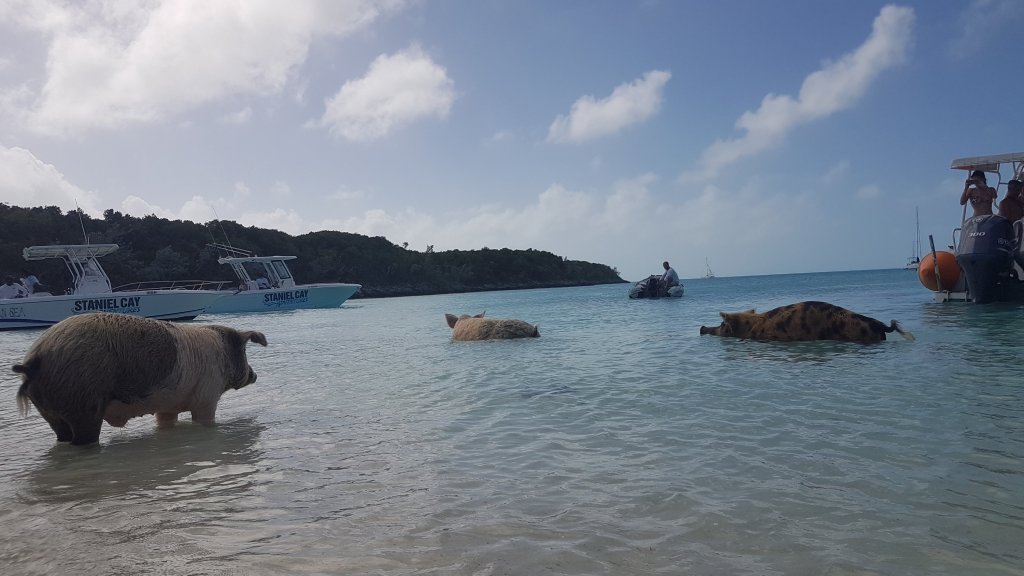 Medan andra båtar låg kvar i den skyddade viken så kryssade vi oss i 18 m/s söderut. Vi seglade inomskärs men det byggdes ändå upp korta och branta stoppvågor så någon vidare fart fick vi aldrig riktigt upp. Men vi ville så gärna hinna ner till Georgetown till dess att mina föräldrar och barnens mormor och morfar skulle flyga in. Vi seglade endast dagtid då navigering inomskärs i Bahamas ofta kräver skarpa ögon och full fokus på lömska grund. En av öarna som vi stannade några dagar vid var Staniel Cay. Ön jämte kallas Pig island. Detta något underligga namn grundar sig just i alla grisar som lever på ön, och som även märkligt nog har lärt sig att simma. Barnen hade längtat efter detta ställe sedan de fick det berättat för sig i San Blas. Med andra ord en väldigt lång väntan. Så morgonen efter var de mer än redo för detta spännande och udda möte. Vi tog oss in till stranden där grisarna höll till och fick en mindre chock när vi såg spektaklet framför våra ögon. För inne vid stranden var det inga små grisar som gick runt bland turisterna. Nej dessa liknade inte på något vis de som jag haft i tankarna. Detta var enorma vilda grisar med långa hårstrån och hörntänder som äkta vildsvin och de rusade fram och tillbaka i jakt på turisternas morötter. Det låg en del små motorbåtar ankrade vid stranden och på dess sidor var det flera grisar som hoppade upp med sina stora klövar. Nästan halvvägs inne i båtarna försökte de sedan sno åt sig äppplen eller annat mumsigt som de blev matade med. Vi insåg snabbt att vår lilla mjuka jolle aldrig skulle överleva en sådan grisattack, så Anders släppte av mig och barnen inne vid stranden. Det gäller ju ändå att prioritera vad som är viktigt och mest ömtåligt, och sedan skyndade han sig ut på djupare vatten. De modigaste grisarna simmade efter honom i hopp om en godisbit och starka som de var så fick han ta sig en bra bit ut inann de gav upp. Det var mycket turister på stranden men det var ändå häftigt att se det hela. Vi gick inte ut i vattnet för att bada med någon gris för i mina ögon var dessa djur både för stora, för närgångna och utrustade med alldeles för hårda klövar för att jag skulle känna mig bekväm med att låta barnen simma med dem. Vi fick tillräckligt med blåmärken av att vara på stranden. Men däremot fanns det en hel del små griskultingar som var betydligt mjukare och mer vänligt inställda. Grismamman tycktes också nöjd när kultingarna lät henne vara ifred för att bli klappade en stund.