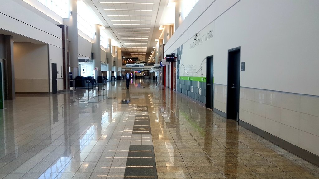 Ekande tomma korridorer på flygplatserna. De få människor vi träffade var utrustade med munskydd och i vissa fall i rymddräktsliknande skyddsdräkter.