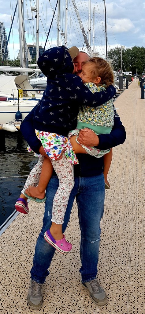 Jag och barnen fick ett mysigt dygn tillsammans med resten av familjen Hera (Lonneke, Thom och Sven) i Amsterdam innan Anders och Maureijn kom in i hamn. Vi fick gosa med deras vackra och enorma hund Lex, smaka på holländska delikatesser och diskutera livet på land. Den där sista dagen, då vi äntligen skulle få träffa Anders igen, gick vi alla runt och räknade ner minuterna. Det var svårt att ta in att vi nu, efter tre oändligt långa månader, äntligen skulle få träffa honom igen. Vi var överlyckliga och samtidigt tror jag att vi var lite nervösa. Vi hade varit ifrån varandra under så lång tid och nu kändes det plötsligt som att jag skulle på en första date med min man! Kommer jag ens att känna igen honom med allt skägg?! funderade jag medans jag tittade på Agnes teckning som hon gjort av sin pappa. När båten sedan sakta kom inglidandes i hamnen och vi såg Anders stå där längst fram i fören så blev det skrik och jubel. Barnen dansade, skrattade, grät, sjöng och hoppade på bryggan och det var inte många ögon i hamnen som var torra. Anders gjorde ett elegant svan-hopp från fören ner på bryggan och detta i sig är väldigt imponerande efter 13 dagar till havs. Sedan blev han överfallen i ett fantastiskt kram- och pusskalas. Det var ett gediget sjörövar-skägg han satt inne med men jo, vi kände allt igen honom! Barnen, som hade galet mycket att berätta för pappa pratade sedan non-stop i flera dagar. ”De pratar ju både på ut- och inandning!” viskade Anders lätt chockat åt mig. Han försökte tappert hänga med i svängarna men det syntes att det var en viss kontrast i intensiteten från de konversationer han haft under sin ensamsegling.