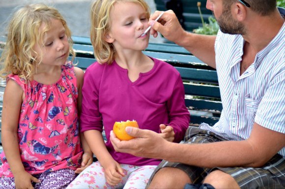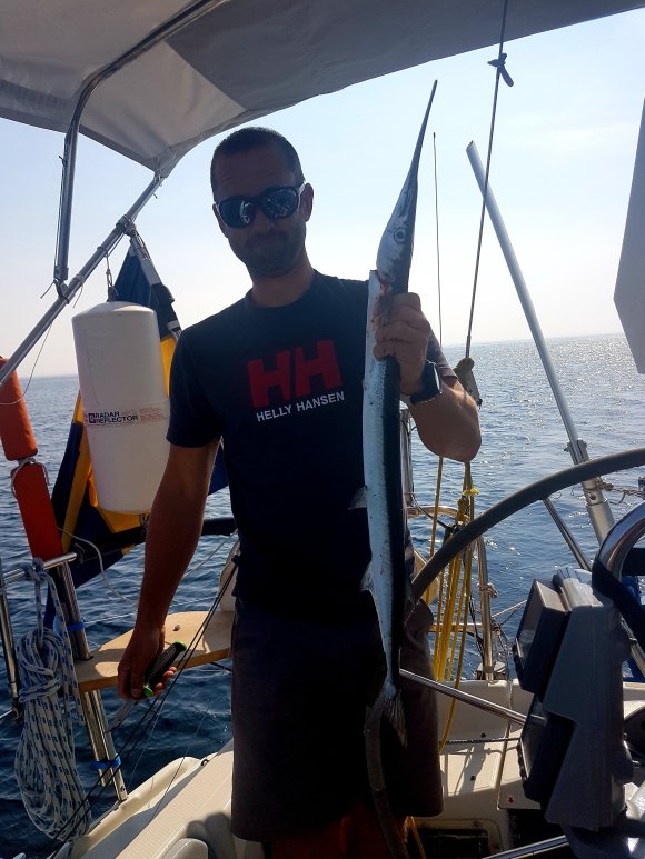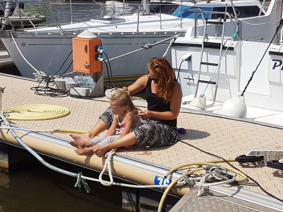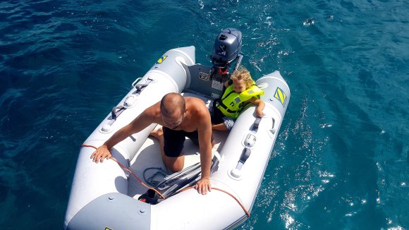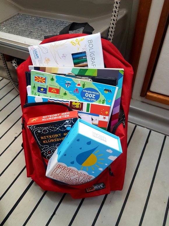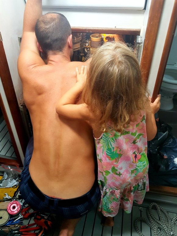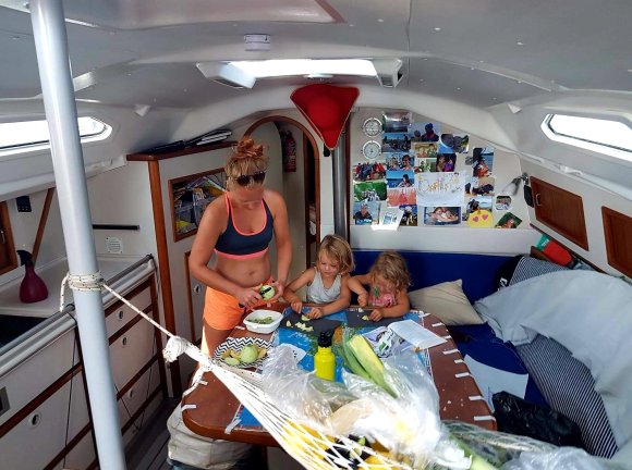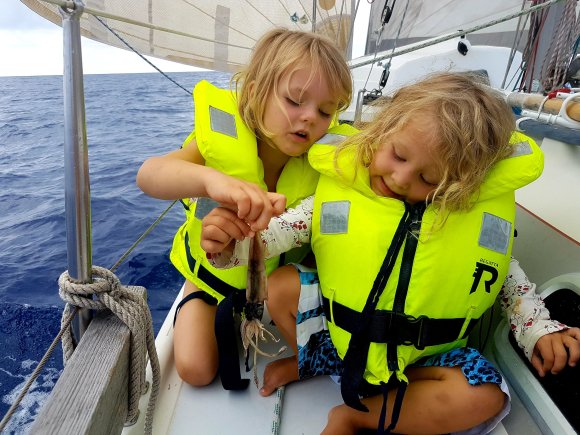 Det här med kvällsrutiner ser lite annorlunda ut än hemma och jag tror vi kan räkna på en hands fingrar de gånger barnen somnat i ”vanlig” tid. I början var vi oroliga för det. Men vad spelar det egentligen för roll att vi nu äter kvällsmat när vi i vanliga fall gick och la oss? Eller att vi hoppar i havet för ett kvällsdopp långt efter att barnkanalen hemma slutat sända? Eller för den sakens skull, unnar oss sovmorgon väldigt mycket oftare än vi har lyxen att göra i vardagen hemma. Barnens båtskola håller ingen konsekvent starttid och i början undrade Tilda om hon försovit sig. Nu har hon insett att skolan börjar lite närsomhelst under dagen beroende på väder, vind och huruvida vi ligger i hamn eller seglar. Men såvida vi inte är allt för sjösjuka så försöker vi hålla någorlunda konsekvent skola ombord, även om skolan i sig inte alltid innebär vid en skolbänk med penna och papper. Tilda vill gärna ha skola även lördagar och söndagar men där har jag sagt ifrån att läraren vill ha ledigt. Och det är icke förhandlingsbart. Läraren vill också ha höstlov. Men å andra sidan sker undervisning alla vakna timmar däremellan och oundvikligen lär vi oss enorma mängder om havet, djur och natur, språk, kulturer, människor, om varandra och om handdiskning, hållaordningpåminimalyta, bråka, dela och mycket annat. Det ingår också en hel del om hur man sparar på vattnet mest effektivt, vad som händer när vi spolar i toaletten, hur man rensar en förgasare, hur många dagar man klarar sig utan att duscha och hur sjutton man lurar en fisk på kroken. Fast det sista har vi inte riktigt fått kläm på än. Iallafall inte de exotiska fiskarna.