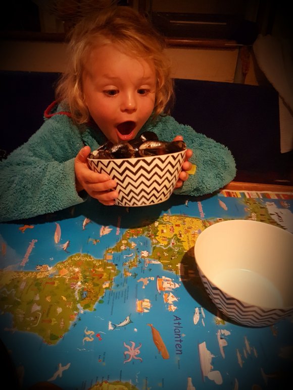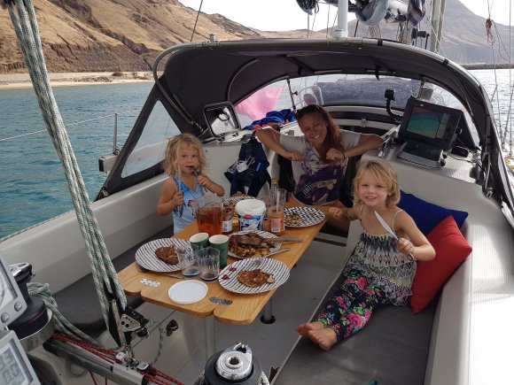 Agnes ville sedan absolut ha ett piratkalas på sin födelsedag, och vilken setting passar inte bättre än en ”öde” ö till det? Dagen innan hade vi seglat vidare från Marina Rubicon till Isla de Lobos, en liten ö strax norr om Fuerteventura. Riktigt öde var den kanske inte och tur var ändå det. För oavsett hur vackert det är runtomkring så behövs det vänner med för att få ett riktigt lyckat kalas. Och norsk skönsång såklart. Agnes blev överröst med kärlek från så många håll och jag blev tårögd mer än en gång under dagen. På kvällen slog Nausica sitt personbästa och tog emot 15 personer i sittbrunnen. Tack besättningen på Elvira och Mamosa för en fantastisk dag. På kvällen fick vi in lite täckning i mobilen och vi kunde lyssna till bästisen Almas födelsedagshälsning hemifrån. Det var en väldigt nöjd och lycklig fyraåring som på tidiga natten somnade i mitt knä i sittbrunnen till ljudet av vuxnas prat och skratt.
