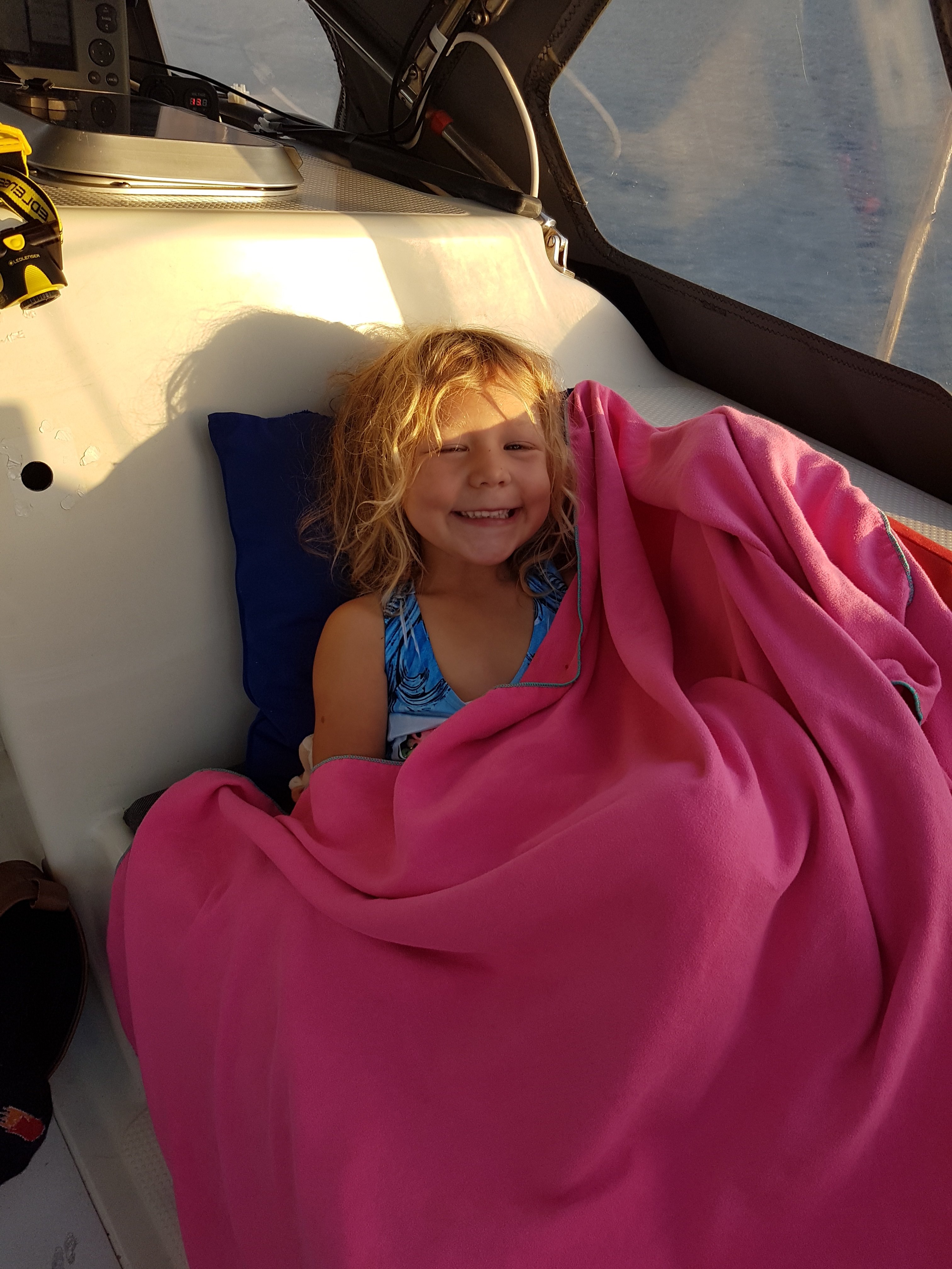 Det här med kvällsrutiner ser lite annorlunda ut än hemma och jag tror vi kan räkna på en hands fingrar de gånger barnen somnat i ”vanlig” tid. I början var vi oroliga för det. Men vad spelar det egentligen för roll att vi nu äter kvällsmat när vi i vanliga fall gick och la oss? Eller att vi hoppar i havet för ett kvällsdopp långt efter att barnkanalen hemma slutat sända? Eller för den sakens skull, unnar oss sovmorgon väldigt mycket oftare än vi har lyxen att göra i vardagen hemma. Barnens båtskola håller ingen konsekvent starttid och i början undrade Tilda om hon försovit sig. Nu har hon insett att skolan börjar lite närsomhelst under dagen beroende på väder, vind och huruvida vi ligger i hamn eller seglar. Men såvida vi inte är allt för sjösjuka så försöker vi hålla någorlunda konsekvent skola ombord, även om skolan i sig inte alltid innebär vid en skolbänk med penna och papper. Tilda vill gärna ha skola även lördagar och söndagar men där har jag sagt ifrån att läraren vill ha ledigt. Och det är icke förhandlingsbart. Läraren vill också ha höstlov. Men å andra sidan sker undervisning alla vakna timmar däremellan och oundvikligen lär vi oss enorma mängder om havet, djur och natur, språk, kulturer, människor, om varandra och om handdiskning, hållaordningpåminimalyta, bråka, dela och mycket annat. Det ingår också en hel del om hur man sparar på vattnet mest effektivt, vad som händer när vi spolar i toaletten, hur man rensar en förgasare, hur många dagar man klarar sig utan att duscha och hur sjutton man lurar en fisk på kroken. Fast det sista har vi inte riktigt fått kläm på än. Iallafall inte de exotiska fiskarna.